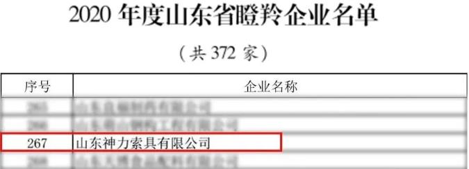 根據省委省政府《關于支持非公有制經濟健康發展的十條意見》(魯發〔2017〕21號)、《山東省瞪羚、獨角獸企業認定管理辦法》(魯工信發〔2020〕8號)、《關于組織申報2020年度山東省瞪羚、獨角獸企業的通知》等文件精神,省工業和信息化廳牽頭組織開展了2020年度瞪羚、獨角獸企業評選工作。山東神力索具有限公司榜上有名,光榮入選“山東省瞪羚企業”。
