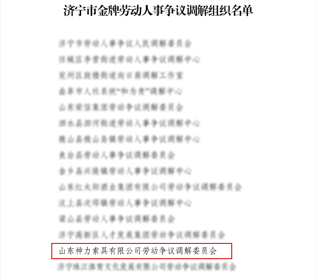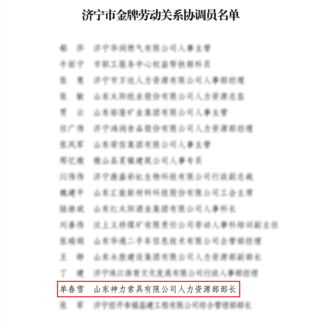 山東神力索具有限公司榜上有名,其中公司勞動爭議調解委員會榮獲“濟寧市金牌勞動人事爭議調解組織”稱號;公司人力資源部部長單春雪榮獲“濟寧市金牌勞動關系協調員”稱號!