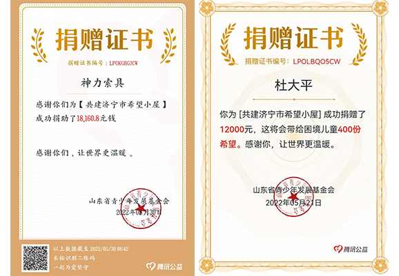 胸懷青云志,不忘赤子心。神力索具勇于承擔社會責任,始終密切關注兒童成長。今年5月份,神力索具總經理杜大平繼續為濟寧市“希望小屋”兒童關愛項目奉獻愛心,其個人捐贈12000元。自2020年,共建“希望小屋”活動開展至今,杜總個人累計捐款近40000元。同時,在杜總的引領下,公司職工自覺打開手機踴躍在線捐款,助力“希望小屋”關愛活動,本次活動,神力索具共計捐款金額18160.8元。