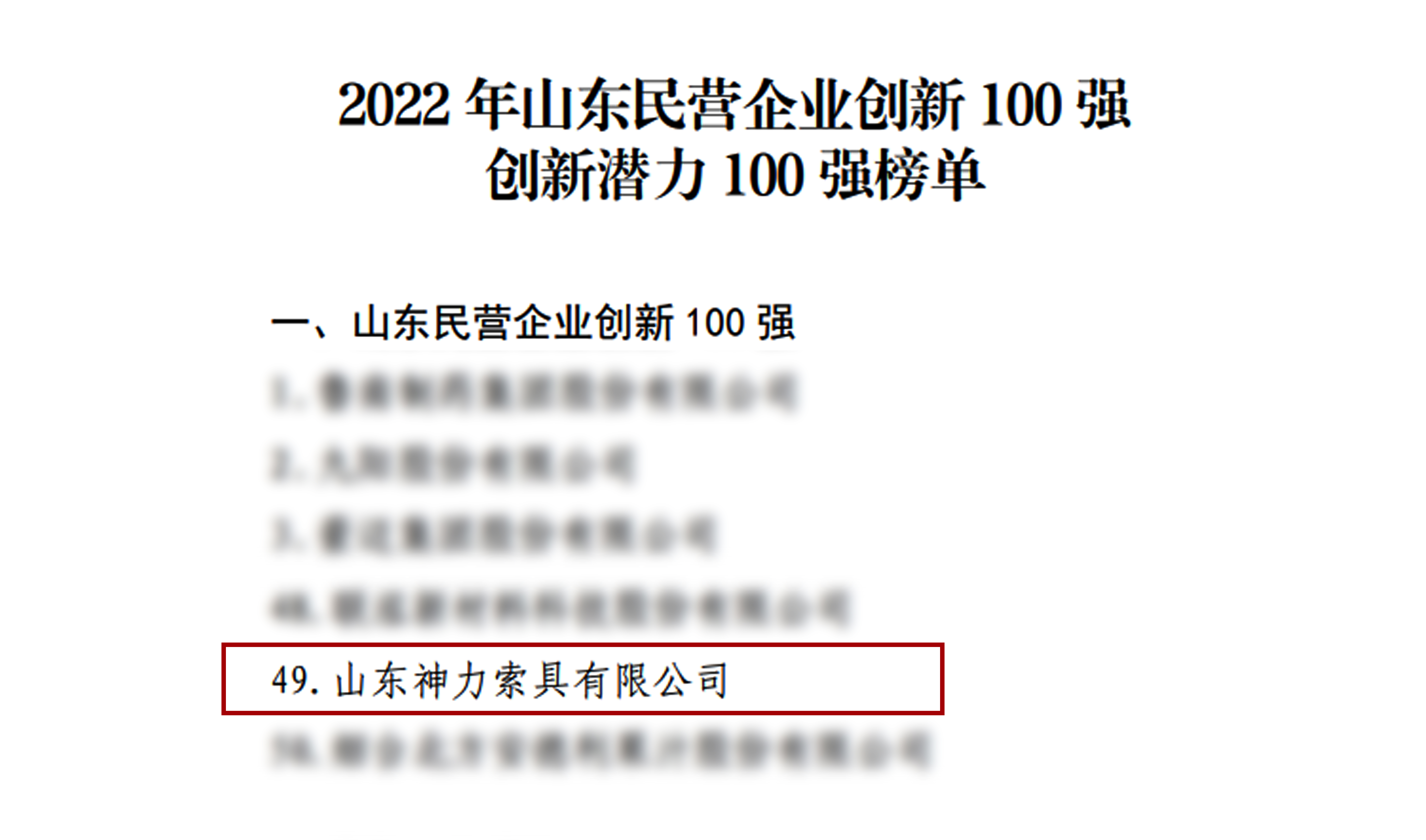 近日,在山東省工商業聯合會、山東省總商會聯合公布的《2022 年山東民營企業創新100強 創新潛力100強榜單》中,神力索具榜上有名,榮獲“山東省民營企業創新100強”稱號。