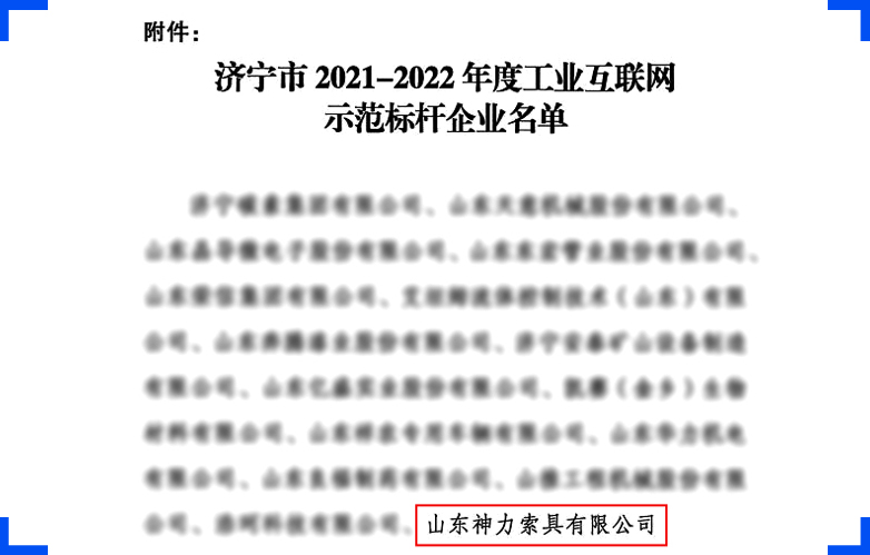日前,濟寧市工業和信息化局發布了《關于公布濟寧市2021-2022年度工業互聯網示范標桿企業的通知》,經企業申報、專家組實地調研、評審論證、網上公示等程序,32家企業成功入選。其中,神力索具榜上有名,榮獲“濟寧市2021-2022年度工業互聯網示范標桿企業”稱號。