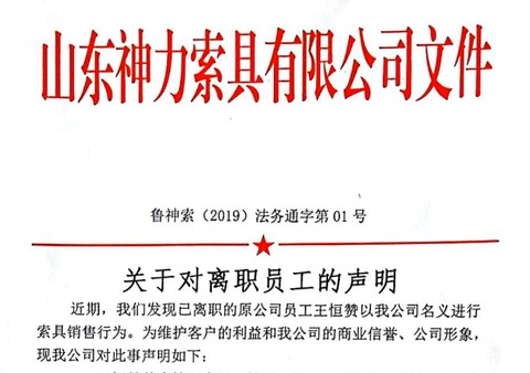 山東審理索具有限公司文件:魯神索(2019)法務通字第01號 關于對離職員工的聲明 近期,我們發現已離職的原公司員工王恒贊以我公司名義進行索具銷售行為。為維護客戶的利益和我公司的商...